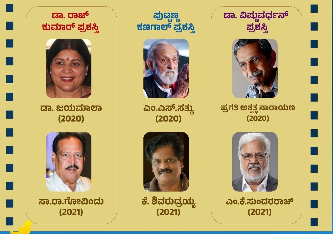 ನಟಿ ಡಾ.ಜಯಮಾಲಾ ಹಾಗೂ ಸಾ.ರಾ.ಗೋವಿಂದು ಅವರು ಡಾ.ರಾಜ್ಕುಮಾರ್ ಪ್ರಶಸ್ತಿ, ಎಂ.ಎಸ್.ಸತ್ಯು ಹಾಗೂ ಕೆ.ಶಿವರುದ್ರಯ್ಯ ಅವರು ಪುಟ್ಟಣ್ಣ ಕಣಗಾಲ್ ಪ್ರಶಸ್ತಿ, ಹಿರಿಯ ಸಿನಿಮಾ ಛಾಯಾಗ್ರಾಹಕ ಪ್ರಗತಿ ಅಶ್ವತ್ಥನಾರಾಯಣ ಹಾಗೂ ಎಂ.ಕೆ.ಸುಂದರರಾಜ್ ಅವರು ಡಾ.ವಿಷ್ಣುವರ್ಧನ್ ಪ್ರಶಸ್ತಿಗಳಿಗೆ ಭಾಜನರಾಗಿದ್ದಾರೆ.