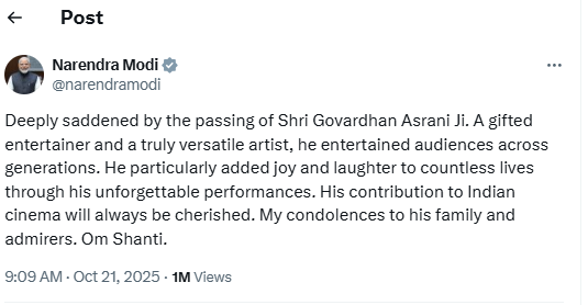 ಗೋವರ್ಧನ್ ಅಸ್ರಾನಿ ಜಿ ಅವರ ನಿಧನದಿಂದ ತೀವ್ರ ದುಃಖವಾಗಿದೆ. ಪ್ರತಿಭಾನ್ವಿತ ನಟ ಹಾಗೂ ಬಹುಮುಖ ಕಲಾವಿದರಾಗಿದ್ದ ಅವರು ತಲೆಮಾರುಗಳಿಂದ ಪ್ರೇಕ್ಷಕರನ್ನು ರಂಜಿಸಿದ್ದಾರೆ. ಅಸ್ರಾನಿ ಅವರು ತಮ್ಮ ಮರೆಯಲಾಗದ ಅಭಿನಯದ ಮೂಲಕ ಅಸಂಖ್ಯಾತ ಜನರಿಗೆ ಸಂತೋಷ ಹಾಗೂ ನಗುವನ್ನು ತರಿಸಿದ್ದಾರೆ. ಭಾರತೀಯ ಚಿತ್ರರಂಗಕ್ಕೆ ಅವರ ಕೊಡುಗೆ ಯಾವಾಗಲೂ ಸ್ಮರಣೀಯವಾಗಿರುತ್ತದೆ. ಅವರ ಕುಟುಂಬ ಮತ್ತು ಅಭಿಮಾನಿಗಳಿಗೆ ನನ್ನ ಸಂತಾಪಗಳು. ಓಂ ಶಾಂತಿ ಎಂದು ಪ್ರಧಾನಿ ಮೋದಿ ಅವರು ಎಕ್ಸ್ನಲ್ಲಿ ಪೋಸ್ಟ್ ಮಾಡಿದ್ದಾರೆ.
