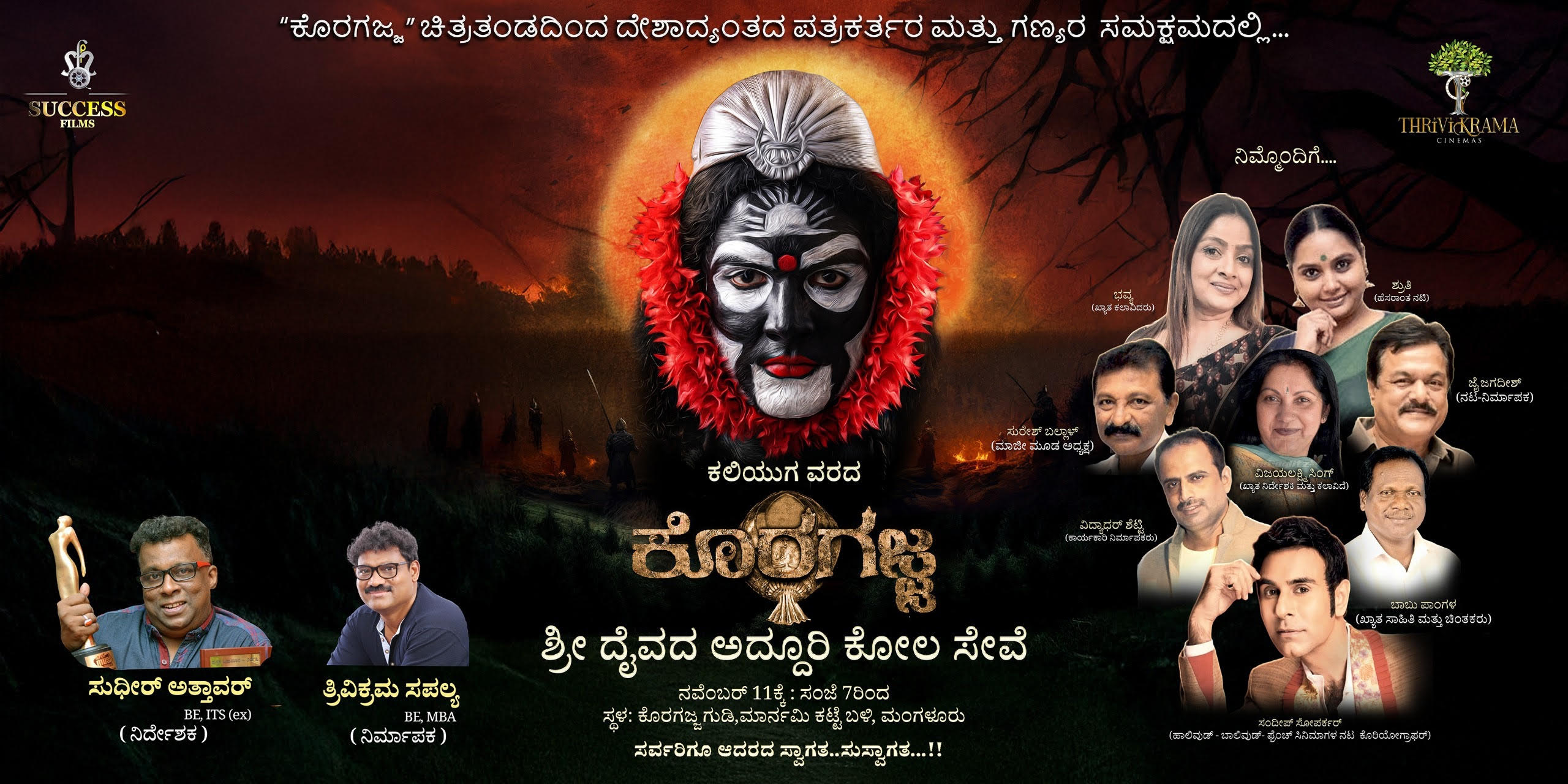 ಇನ್ನೇನು ಬಿಡುಗಡೆ ಹಂತದಲ್ಲಿರುವ ಸುಧೀರ್ ಅತ್ತಾವರ್ ನಿರ್ದೇಶನದ, ತ್ರಿವಿಕ್ರಮ ಸಪಲ್ಯ ನಿರ್ಮಾಣದ, ಸಕ್ಸಸ್ ಫಿಲಂಸ್ ಮತ್ತು ತ್ರಿವಿಕ್ರಮ ಸಿನಿಮಾಸ್ ಬ್ಯಾನರ್ ಅಡಿಯ, ಬಹುನಿರೀಕ್ಷಿತ ಪ್ಯಾನ್ ಇಂಡಿಯಾ ಸಿನಿಮ "ಕೊರಗಜ್ಜ" ಆರಂಭದಿಂದಲೂ ಸಾಕಷ್ಟು ಕುತೂಹಲ ಮೂಡಿಸಿದೆ. ಈ ಚಿತ್ರದ 'ಪ್ಯಾನ್ ಇಂಡಿಯಾ'ರಾಷ್ಟ್ರೀಯ ಮಟ್ಟದ ಪತ್ರಿಕಾಗೋಷ್ಠಿ ಹಾಗೂ ಶ್ರೀ ಕೊರಗಜ್ಜ ದೈವದ ಅದ್ದೂರಿ ಕೋಲ ಸೇವೆ ನವೆಂಬರ್ 11ರಂದು ಮಂಗಳೂರಿನಲ್ಲಿ ನಡೆಯಲಿದೆ. ಈ ಕಾರ್ಯಕ್ರಮಗಳಿಗೆ ದೆಹಲಿ,ಮುಂಬಾಯಿ, ಹೈದರಾಬಾದ್, ಕೊಚ್ಚಿ ಬೆಂಗಳೂರು, ಮಂಗಳೂರು ಹೀಗೆ ದೇಶದ ನಾನಾ ಭಾಗದ ಪ್ರತಿಷ್ಟಿತ ಮಾಧ್ಯಮ ಮಿತ್ರರನ್ನು ಚಿತ್ರತಂಡ ಆತ್ಮೀಯವಾಗಿ ಆಹ್ವಾನಿಸಿ ರಾಷ್ಟ್ರೀಯ ಮಟ್ಟದ ಪತ್ರಿಕಾಗೋಷ್ಠಿ ನಡೆಸಲಿದೆ.