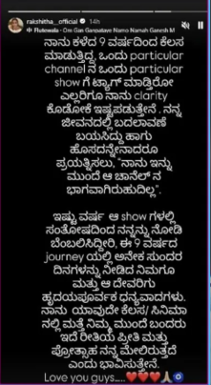 ಈ ಬಗ್ಗೆ ತಮ್ಮ ಇನ್ಸ್ಟಾಗ್ರಾಮ್ ಅಕೌಂಟ್ನಲ್ಲಿ ಪೋಸ್ಟ್ ಹಾಕಿರುವ ರಕ್ಷಿತಾ, ನಾನು ಕಳೆದ 9 ವರ್ಷಗಳಿಂದ ಕೆಲಸ ಮಾಡುತ್ತಿದ್ದ ಒಂದು Perticular channel ನ ಒಂದು Perticular showಗೆ ಟ್ಯಾಗ್ ಮಾಡ್ತಿರೋ ಎಲ್ಲರಿಗೂ ನಾನು ಕ್ಲಾರಿಟಿ ಕೊಡೋಕೆ ಇಷ್ಟಪಡ್ತೀನಿ. ನನ್ನ ಜೀವನದಲ್ಲಿ ಬದಲಾವಣೆ ಬಯಸಿದ್ದು ಹಾಗೂ ಹೊಸದನ್ನೇನಾರು ಪ್ರಯತ್ನಿಸಲು ನಾನು ಇನ್ನುಮುಂದೆ ಆ ಚಾನೆಲ್ನ ಭಾಗವಾಗಿರುವುದಿಲ್ಲ ಎಂದು ಭಾವುಕವಾಗಿ ತಿಳಿಸಿದ್ದಾರೆ.