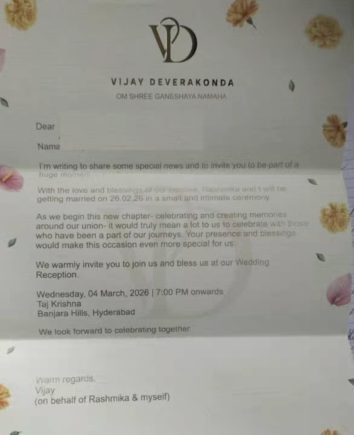 ಕಳೆದ ಕೆಲವು ತಿಂಗಳಿಂದ ರಶ್ಮಿಕಾ ಮಂದಣ್ಣ ಹಾಗೂ ವಿಜಯ್ ದೇವರಕೊಂಡ ಮದುವೆಯಾಗುತ್ತಾರೆ ಎಂಬ ಸುದ್ದಿಗಳು ಹರಿದಾಡುತ್ತಿದ್ದವು. ಇತ್ತೀಚೆಗೆ, ಅವರಿಬ್ಬರು ನಿಶ್ಚಿತಾರ್ಥ ಮಾಡಿಕೊಂಡಿದ್ದಾರೆ ಎಂದು ವರದಿಯಾಗಿತ್ತು. ಇದೀಗ ಅತಿಥಿಗಳಿಗೆ ನೀಡಲಾದ ಅವರ ವಿವಾಹ ಆಮಂತ್ರ ಪತ್ರ ವೈರಲ್ ಆಗಿದ್ದು, ಎಲ್ಲವೂ ಅಧಿಕೃತವಾಗಿದೆ.