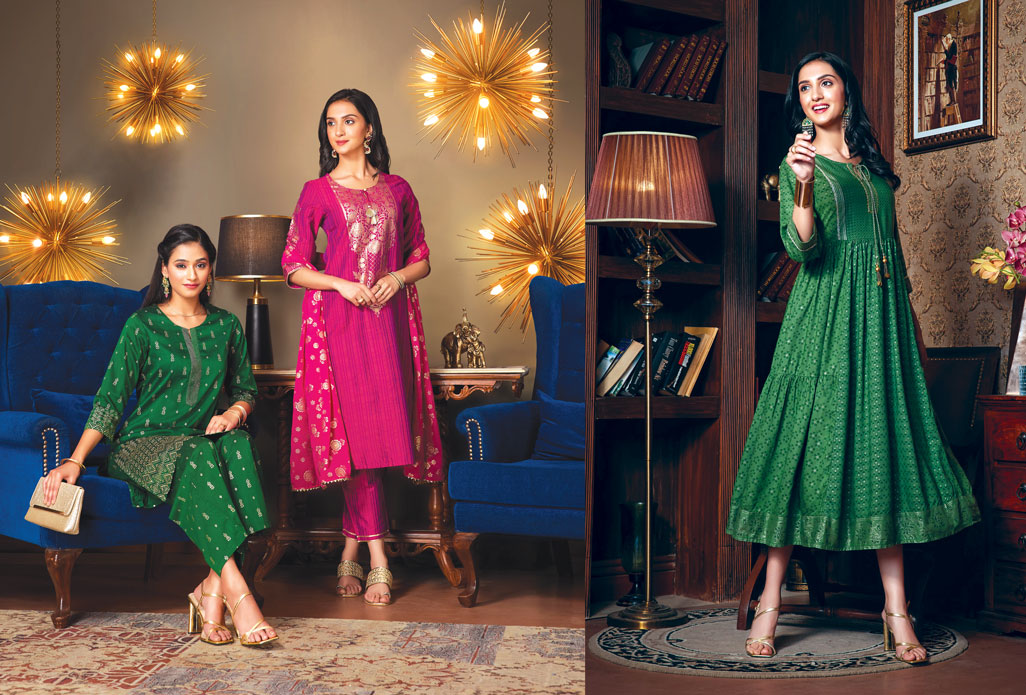 ಗ್ರೀನ್ ಮೆಜೆಂತಾ ಕಲರ್ ನ, ಅತ್ಯಾಕರ್ಷಕ ಗೋಲ್ಡನ್ ಎಂಬ್ರಾಯಿಡರಿಯುಳ್ಳ ಈ ಕುರ್ತಿಗಳು ಎಂಥ ಫಂಕ್ಷನ್/ಪಾರ್ಟಿಗಾದರೂ ಒಪ್ಪುತ್ತವೆ. ಇದರ ಜೊತೆ ಗೋಲ್ಡನ್ ಸ್ಯಾಂಡಲ್ಸ್, ಮ್ಯಾಚಿಂಗ್ ಜ್ಯೂವೆಲರಿ ಧರಿಸಿದ ಮೇಲೆ ಸೊಗಸು ಇಮ್ಮಡಿಸಿದೆ! ನೀವು ಇಂಥದ್ದು ಟ್ರೈ ಮಾಡಿ ಪಾರ್ಟಿಗೆ ಹೊರಡಬಾರದೇಕೆ?