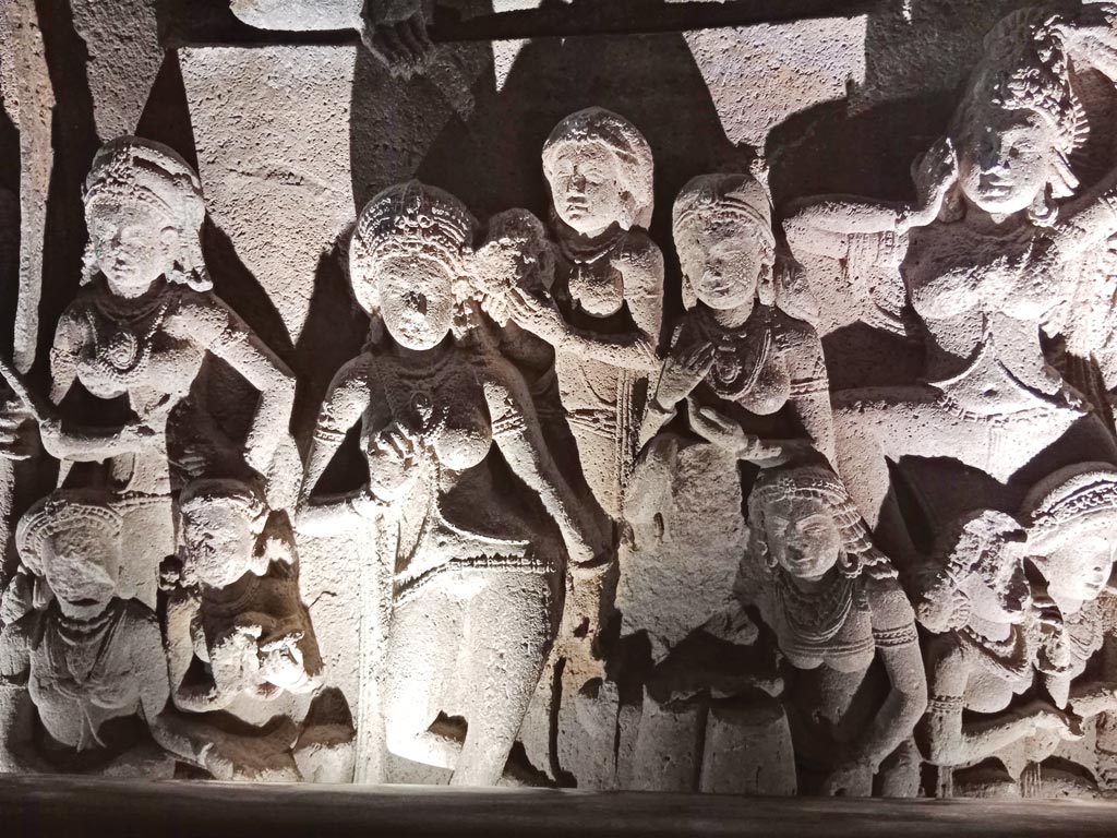 ಶಯನ ಸ್ಥಿತಿಯಲ್ಲಿರುವ ಬುದ್ಧನ ಕೆಳಭಾಗದಲ್ಲಿ ಅವನ ಅನುಯಾಯಿಗಳು ಆತನ ದೇಹ ತ್ಯಾಗದಿಂದ ದುಃಖಿತರಾದರೆ, ಮೇಲ್ಭಾಗದಲ್ಲಿ ದೇವತೆಗಳು ಸಂತೋಷದಿಂದ ಅವನನ್ನು ಬರಮಾಡಿಕೊಳ್ಳುವ ಕಥೆಯನ್ನು ಅತಿ ಸುಂದರವಾಗಿ ಶಿಲ್ಪಿ ಕೆತ್ತನೆ ಮಾಡಿದ್ದಾನೆ. ಶಿಲ್ಪಿಯ ಈ ಅತ್ಯದ್ಭುತವಾದ ಕಲ್ಪನೆ ನೋಡಿ ನಾನು ಒಂದು ಕ್ಷಣ ದಂಗುಬಡಿದಂತಾಗಿ ಮೌನವಾಗಿ ನಿಂತುಬಿಟ್ಟೆ. ಹಾಗೆಯೇ ಈ ಗುಹೆಯಲ್ಲಿ ಬುದ್ಧನು ಜನರಿಗೆ ಬೋಧನೆ ಮಾಡುತ್ತಿರುವ, ಸನ್ಯಾಸಿಗಳು ಧ್ಯಾನ ಮಾಡುತ್ತಿರುವ, ನಾಟ್ಯ ರಾಣಿಯರು ನರ್ತಿಸುತ್ತಿರುವ, ಹೂ ಗಿಡಗಳ, ಪ್ರಾಣಿ ಪಕ್ಷಿಗಳ ನಯನ ಮನೋಹರವಾದ ಕೆತ್ತನೆಗಳನ್ನು ಕಾಣಬಹುದು.