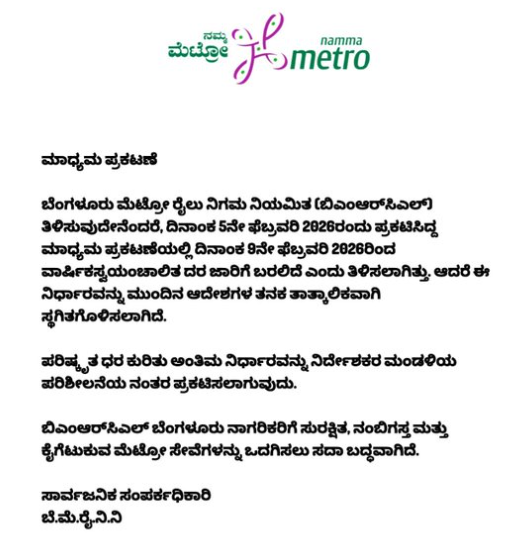 ಮೆಟ್ರೋ ಟಿಕೆಟ್ ದರ ಏರಿಕೆ ಕೈಬಿಟ್ಟ ಬಿಎಂಆರ್ಸಿಎಲ್