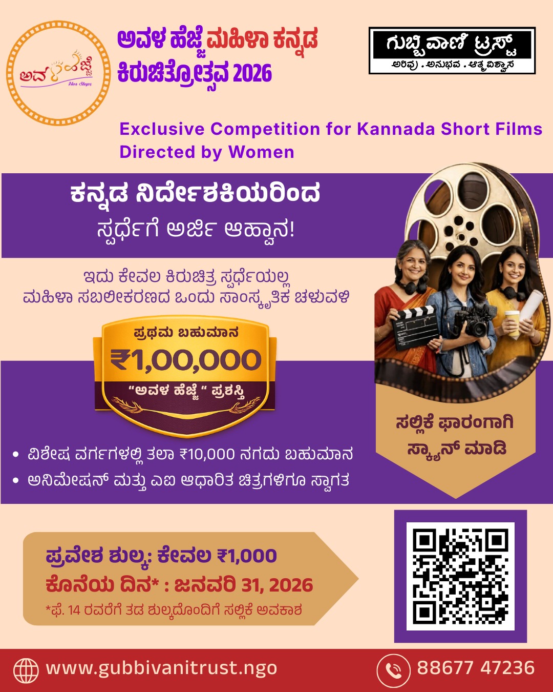 “ಅವಳ ಹೆಜ್ಜೆ ಕಿರುಚಿತ್ರೋತ್ಸವ-2026”: ಕನ್ನಡ ಕಿರುಚಿತ್ರ ಸ್ಪರ್ಧೆಯಲ್ಲಿ ಭಾಗವಹಿಸಲು ಮಹಿಳಾ ನಿರ್ದೇಶಕಿಯರಿಗೆ ಕರೆ