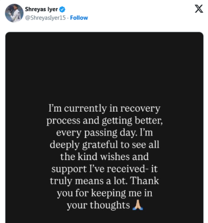 'ನಾನು ಸದ್ಯ ಚೇತರಿಕೆಯ ಹಂತದಲ್ಲಿದ್ದೇನೆ ಮತ್ತು ದಿನ ಕಳೆದಂತೆ ಚೇತರಿಸಿಕೊಳ್ಳುತ್ತಿದ್ದೇನೆ' ಎಂದು ಅಯ್ಯರ್ ಮೊದಲ ಬಾರಿಗೆ ತಮ್ಮ ಎಕ್ಸ್ ಮತ್ತು ಇನ್ಸ್ಟಾಗ್ರಾಂನಲ್ಲಿ ಪೋಸ್ಟ್ ಮಾಡಿದ್ದಾರೆ.