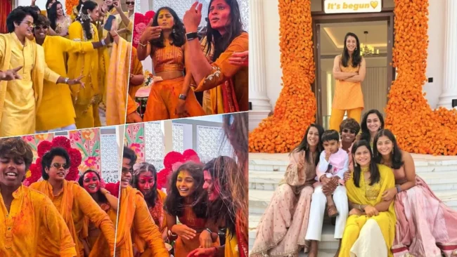 ಹಳದಿ ಸೆರಮನಿ: ವಿವಾಹಕ್ಕೂ ಮುನ್ನ ಹಳದಿ ಶಾಸ್ತ್ರವು ಅದ್ಧೂರಿಯಾಗಿ ನಡೆದಿದೆ. ಸ್ಮೃತಿ ಮಂದಾನ ವಿವಾಹವನ್ನು ಭಾಗಿಯಾಗಲು ಆಪ್ತ ಆಟಗಾರ್ತಿಯರು ಸಾಂಗ್ಲಿಯಲ್ಲಿ ಬೀಡು ಬಿಟ್ಟಿದ್ದಾರೆ. ಕುಟುಂಬಸ್ಥರು, ಆಪ್ತರು ಸಂಭ್ರಮದಿಂದ ಭಾಗಿಯಾಗಿದ್ದಾರೆ. ಕಾರ್ಯಕ್ರಮದಲ್ಲಿ ಮಂದಾನ, ಪಲಾಶ್ ಡ್ಯಾನ್ಸ್ ಮಾಡಿ ಸಂಭ್ರಮಿಸಿದ್ದಾರೆ. ಟೀಮ್ ಇಂಡಿಯಾ ಆಟಗಾರ್ತಿಯರೇ ಸೆಂಟರ್ ಆಫ್ ಅಟ್ರಾಕ್ಷನ್ ಆಗಿದ್ದು, ಜೆಮಿಮಾ ರೋಡ್ರಿಗಸ್, ರಾಧಾ ಯಾದವ್, ಶ್ರೇಯಾಂಕ ಪಾಟೀಲ್, ಅರುಂಧತಿ ರೆಡ್ಡಿ, ಶೆಫಾಲಿ ವರ್ಮಾ ಸಖತ್ ಸ್ಟೆಪ್ ಹಾಕಿ ಎಂಜಾಯ್ ಮಾಡಿದ್ದಾರೆ.