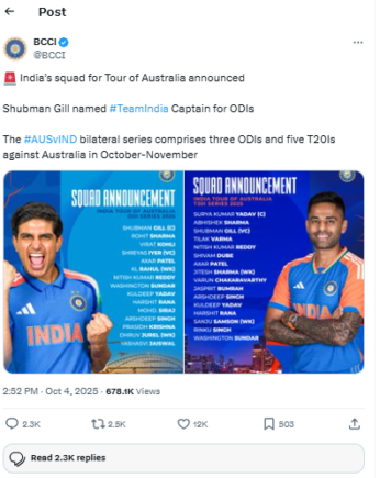 ಏಕದಿನ ಹಾಗೂ ಟಿ20 ಸರಣಿ ಒಳಗೊಂಡಿರುವ ಆಸ್ಟ್ರೇಲಿಯಾ ಪ್ರವಾಸಕ್ಕೆ ಭಾರತ ತಂಡ ಪ್ರಕಟವಾಗಿದ್ದು, ಏಕದಿನ ಕ್ರಿಕೆಟ್ ತಂಡದ ನಾಯಕರಾಗಿ ಶುಭ್ ಮನ್ ಗಿಲ್ ಆಯ್ಕೆಯಾಗಿದ್ದಾರೆ.