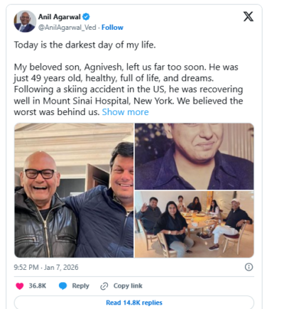 ವೇದಾಂತ ಗ್ರೂಪ್​ನ ಸಂಸ್ಥೆಗಳಲ್ಲಿ ಸಕ್ರಿಯವಾಗಿ ತೊಡಗಿಸಿಕೊಂಡಿದ್ದ ಅಗ್ನಿವೇಶ್ ಅಗರ್ವಾಲ್ , ಸ್ಕೈಯಿಂಗ್ ಆಡುವಾಗ ಅಪಘಾತಗೊಂಡು ಗಾಯಗೊಂಡಿದ್ದರು. ನ್ಯೂಯಾರ್ಕ್​ನ ಮೌಂಟ್ ಸಿನಾಯ್ ಆಸ್ಪತ್ರೆಯಲ್ಲಿ ಚಿಕಿತ್ಸೆ ಪಡೆಯುತ್ತಿದ್ದ ಅವರು ಗುಣಮುಖರಾಗಿದ್ದರು. ಆದರೆ, ಇದೀಗ ದಿಢೀರ್ ಕಾರ್ಡಿಯಾಕ್ ಅರೆಸ್ಟ್ ಆಗಿ ನಿಧನರಾಗಿದ್ದಾರೆ. ತಮ್ಮ ಮಗನ ಮರಣವು ತಮ್ಮ ಜೀವನದ ಅತ್ಯಂತ ಕರಾಳ ದಿನ ಎಂದು ತಂದೆ ಅನಿಲ್ ಅಗರ್ವಾಲ್ ಹೇಳಿದ್ದಾರೆ.